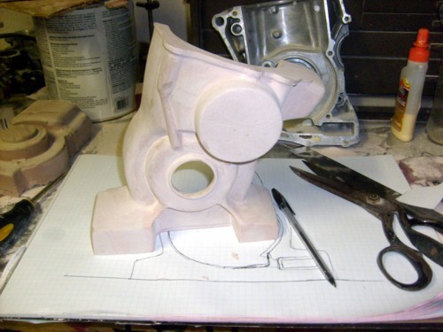 My original attempt. This was my Idea to make a one mold fits all MX 2 cycle 250cc engines. It didn’t work. while this is the same mold I use now It’s been highly modified and will only work with case inducted 250cc engines.