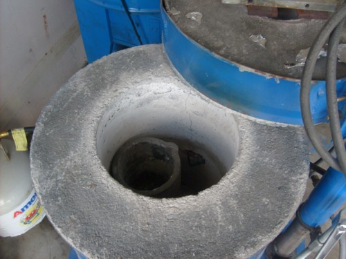 The burner it’s self. a piece of 1″ black iron pipe 12″ long, a 1 1/2″-1″ reducer makes up the venturi, a 1/8″ cross pipe drilled with a .040 bit locked center by a 1/4 20 jam bolt. hooked up to a 20lb propane tank and she’ll melt 20lbs of cut up alumium alloy car parts in 45 minutes. I do point my shop fan at the burner to increase air flow and to help vent the gases up out of the furnace and out of the garage.