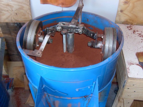 You have got to have one, don’t waist one second of your time hand mulling any thing. I built the one in Col C’s book. I wouldn’t do that again either, it’s great for mulling very small amounts. But 200lbs of sand is (4) 50lb bags, the little LP mullers only hold less than 10lbs at a crack.