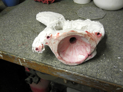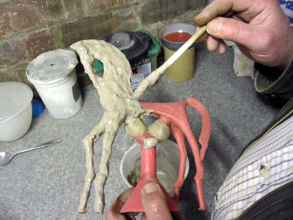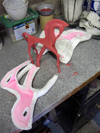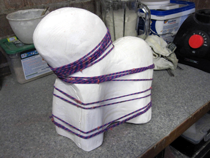 The clay model is covered in RTV rubber material. Then a supporting mould of plaster is constructed, an important feature is where the plaster mould parting line is made, so that it can be separated after setting.
